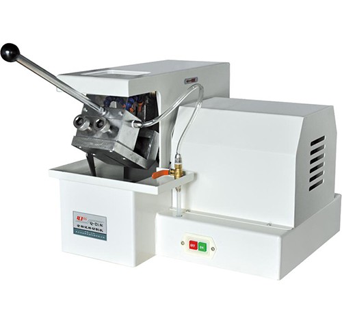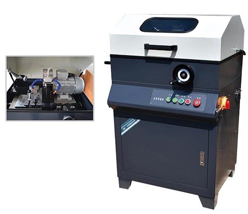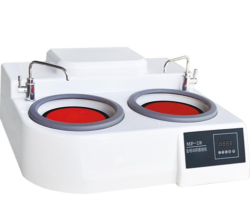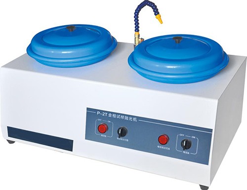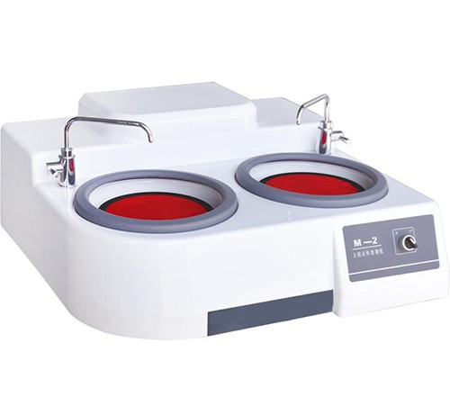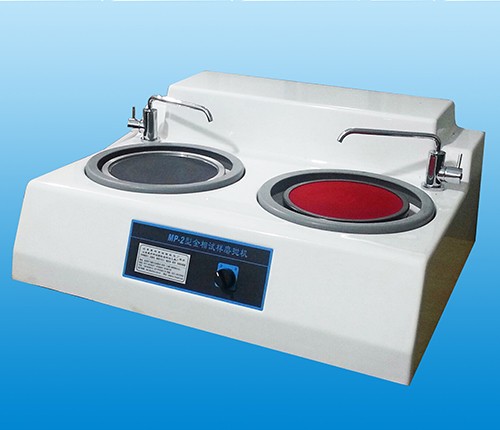 該機左盤為預(yù)磨盤,右盤為拋光盤。預(yù)磨時,通過回轉(zhuǎn)水咀將冷卻水不斷注入旋轉(zhuǎn)的磨盤中,砂紙在大氣壓的作用下可以緊貼在磨盤上,從而不須將砂紙粘結(jié)或夾緊。拋光時,可將拋光織物平鋪在拋光盤上,然后用扣圈扣緊織物,再進行拋光,織物和拋光盤都可及時方便的更換。